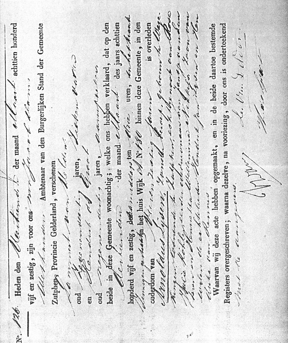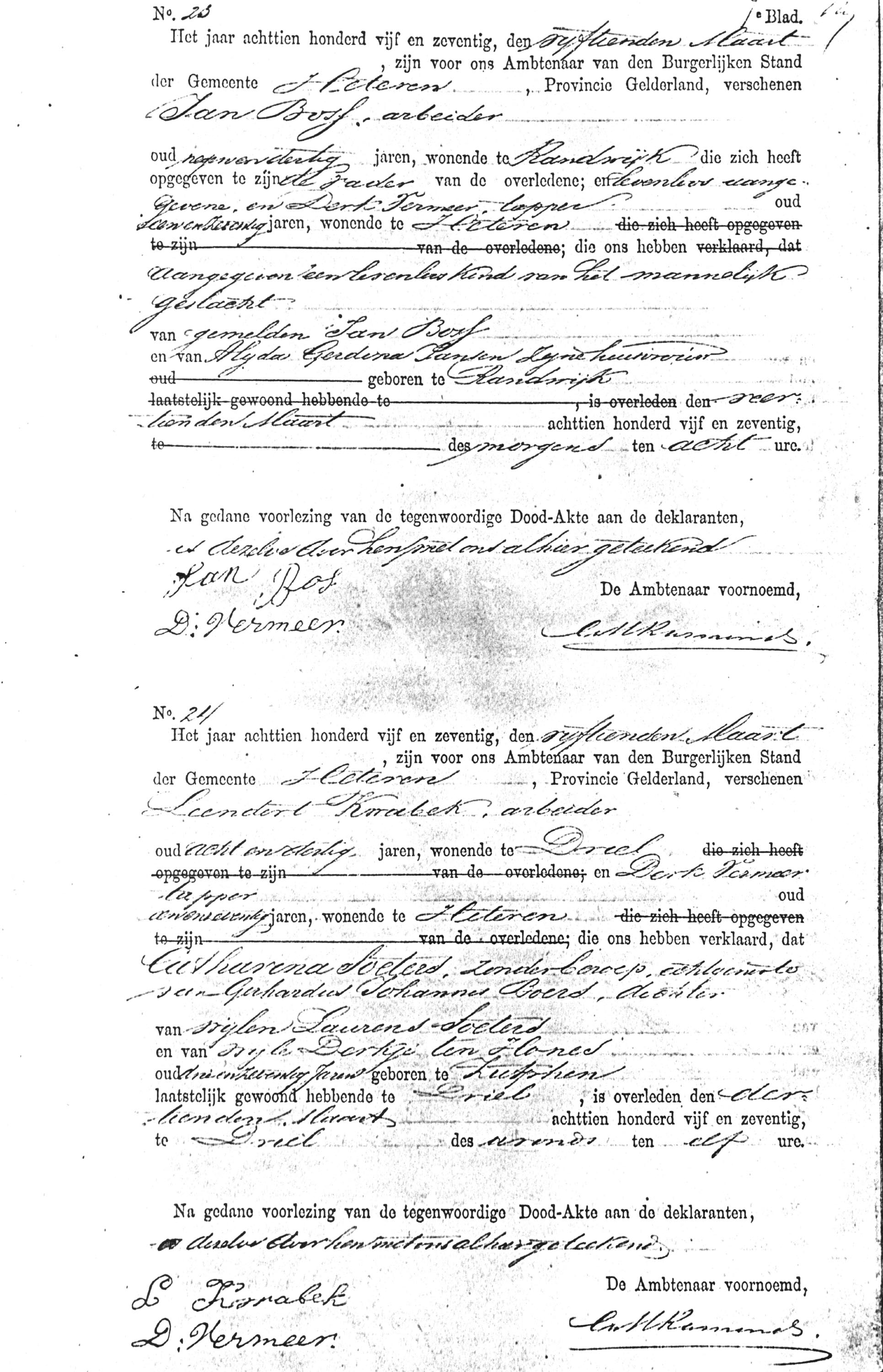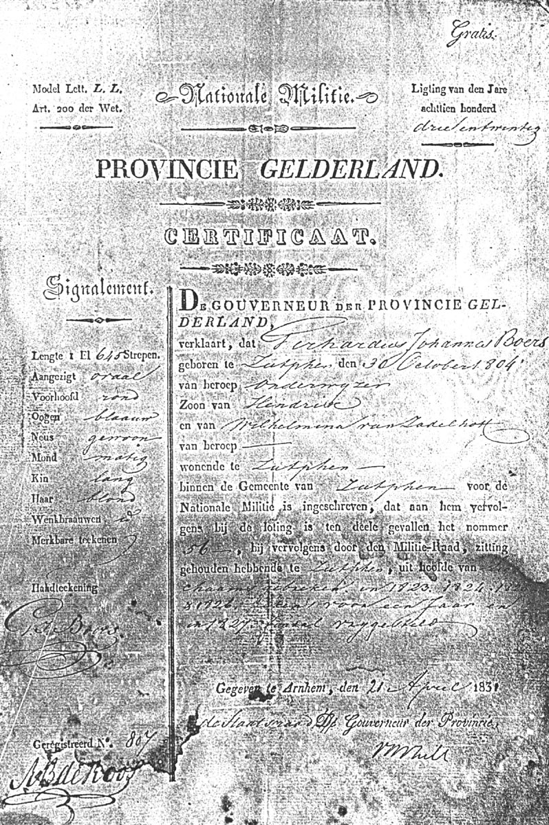 32. Gerhardus Johannes Boers [image] 1, 2, 3 was born 4 on 30 Oct 1804. He died 5 on 23 Jun 1892. He married 6 Catharina Soeters on 27 May 1831 in Heteren, Nederland. Gerhardus worked as a Onderwyser, Koster. [Parents]